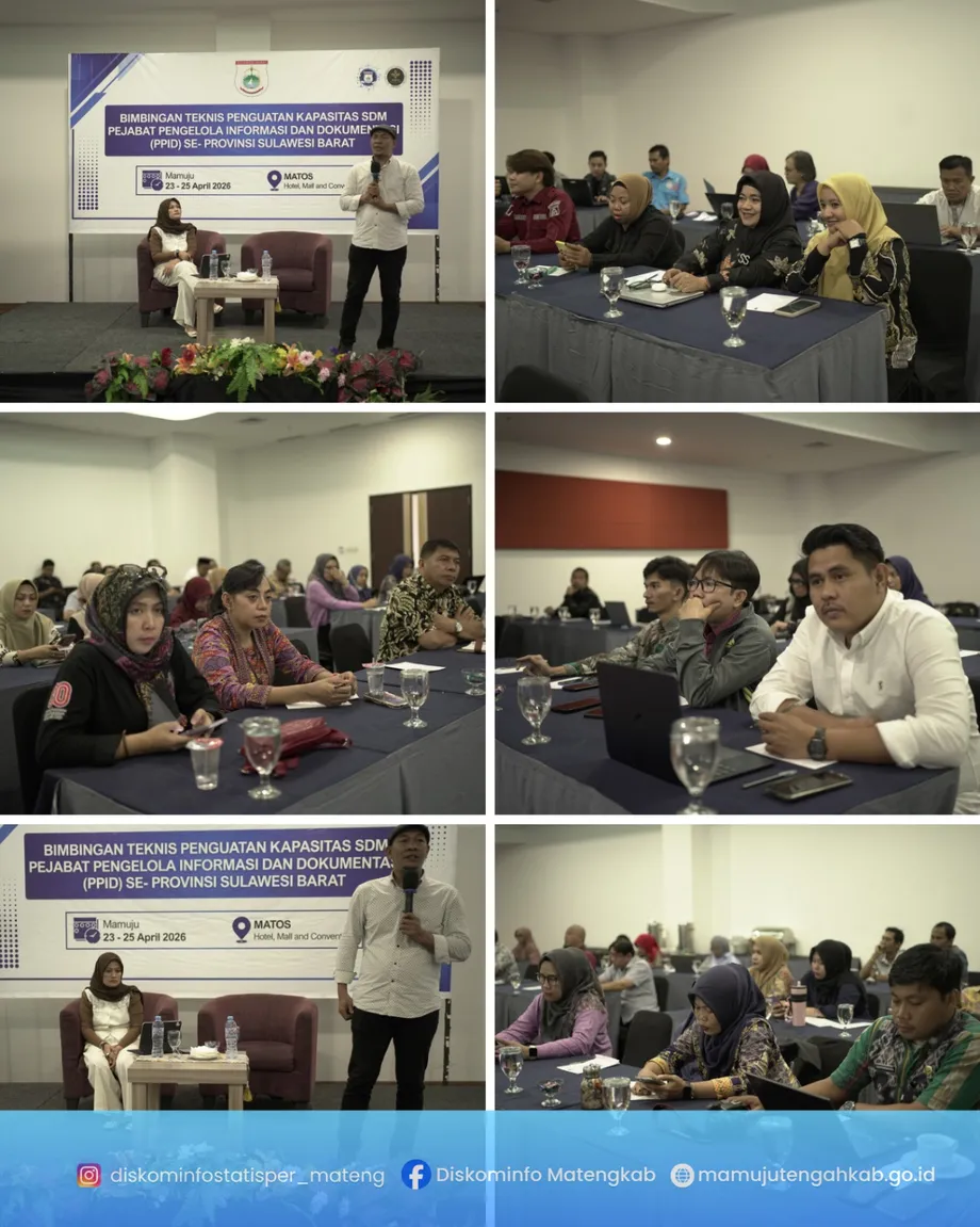 Mamuju — Pemerintah Kabupaten Mamuju Tengah melalui Dinas Komunikasi, Informatika, Statistik dan Persandian (Diskominfo) mengikuti kegiatan Bimbingan Teknis (Bimtek) Penguatan Kapasitas Sumber Daya Manusia Pejabat Pengelola Informasi dan Dokumentasi (PPID) yang diselenggarakan oleh Pemerintah Provinsi Sulawesi Barat. Kegiatan ini berlangsung selama tiga hari, mulai tanggal 23 hingga 25 April 2026, bertempat di Hotel Matos, Kabupaten Mamuju.